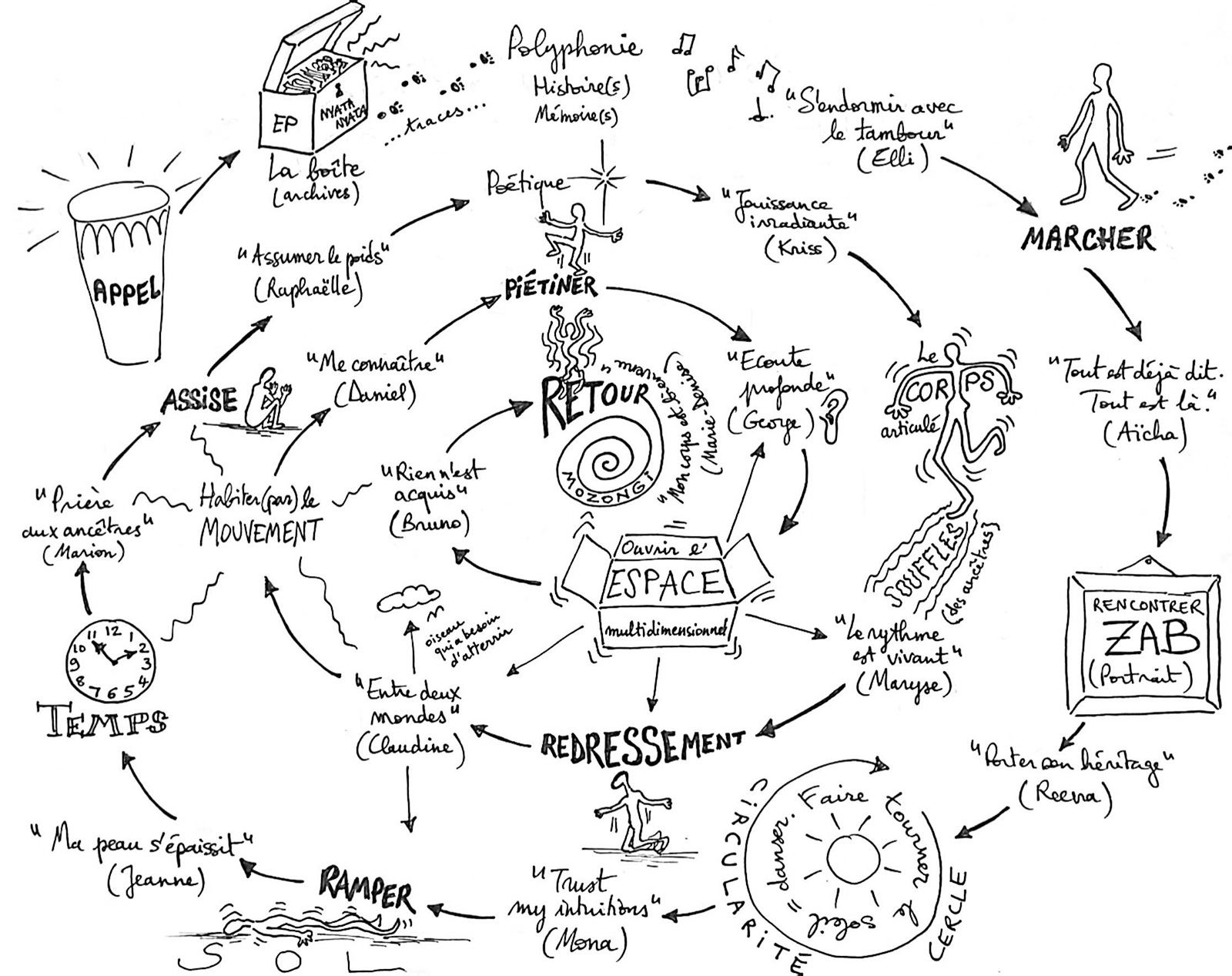 J’ai donc composé la dramaturgie de cette boîte comme une polyphonie, croisant les voix et les angles de vue. Les réflexions de Zab sur le rythme, la poétique et le mouvement se tissent autour de mes analyses de la pièce à travers sa temporalité, le corps et l’espace. J’ai également recueilli quatorze témoignages d’artistes ayant collaboré aux différentes distributions de Mozongi depuis près de trente ans, et pris en note, telle une scribe, les indications de Zab adressées aux interprètes durant le processus de remontage de la pièce. Consciente de – et embarrassée par – ma posture eurocentrée issue de la danse contemporaine occidentale avec, qui plus est, un profil universitaire, j’espère éviter autant que possible la « mise en boîte » de son discours en le gardant vivant à travers une structure polyphonique – voire polyrythmique – qui assume un « assemblage de voix » disparate et une « écriture à plusieurs voix, obéissant aux règles du contrepoint », pour reprendre les définitions qu’en donne le dictionnaire Larousse.
